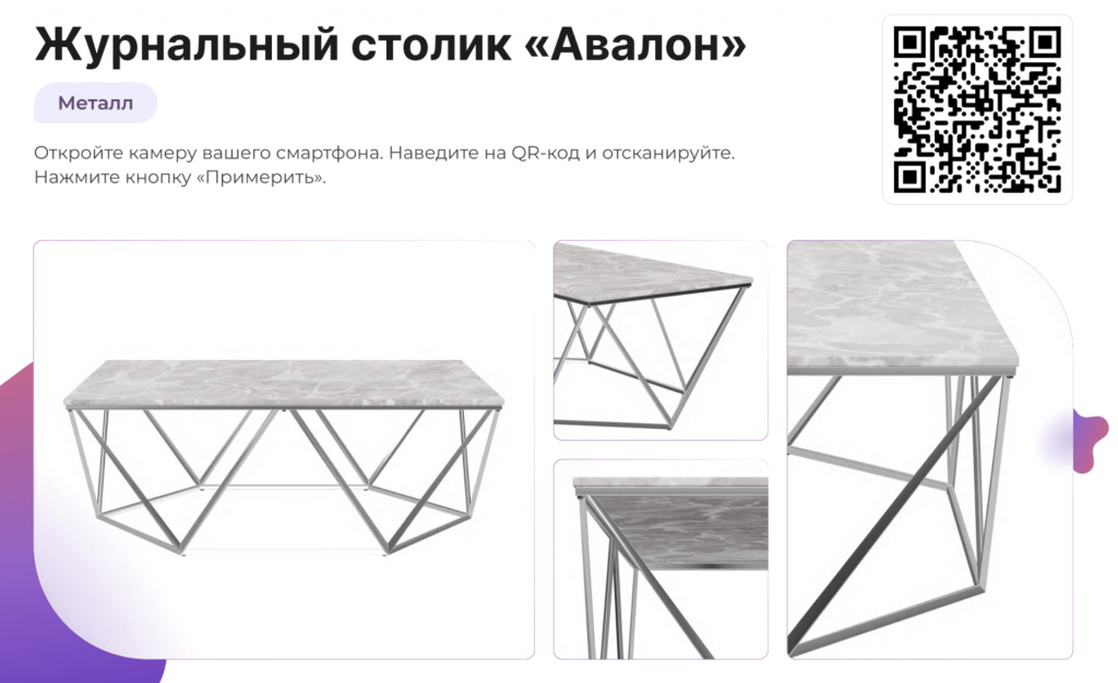 Пример страницы из AR-каталога мебели. Отсканируйте код на экране, чтобы рассмотреть и виртуально разместить столик в своей комнате.